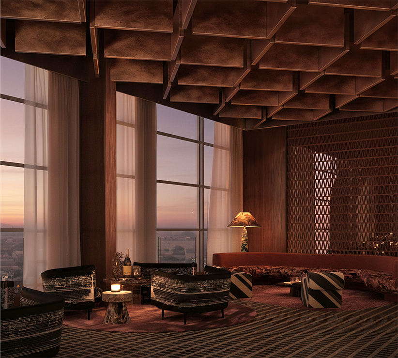 In contrast, the material palette draws from Peru’s bold identity—deep terracotta tones, richly patterned stone, and tactile textiles introduce warmth, depth, and vibrancy. Custom chandeliers, composed of delicate suspended elements, float like luminous installations, adding movement and theatricality to the space.