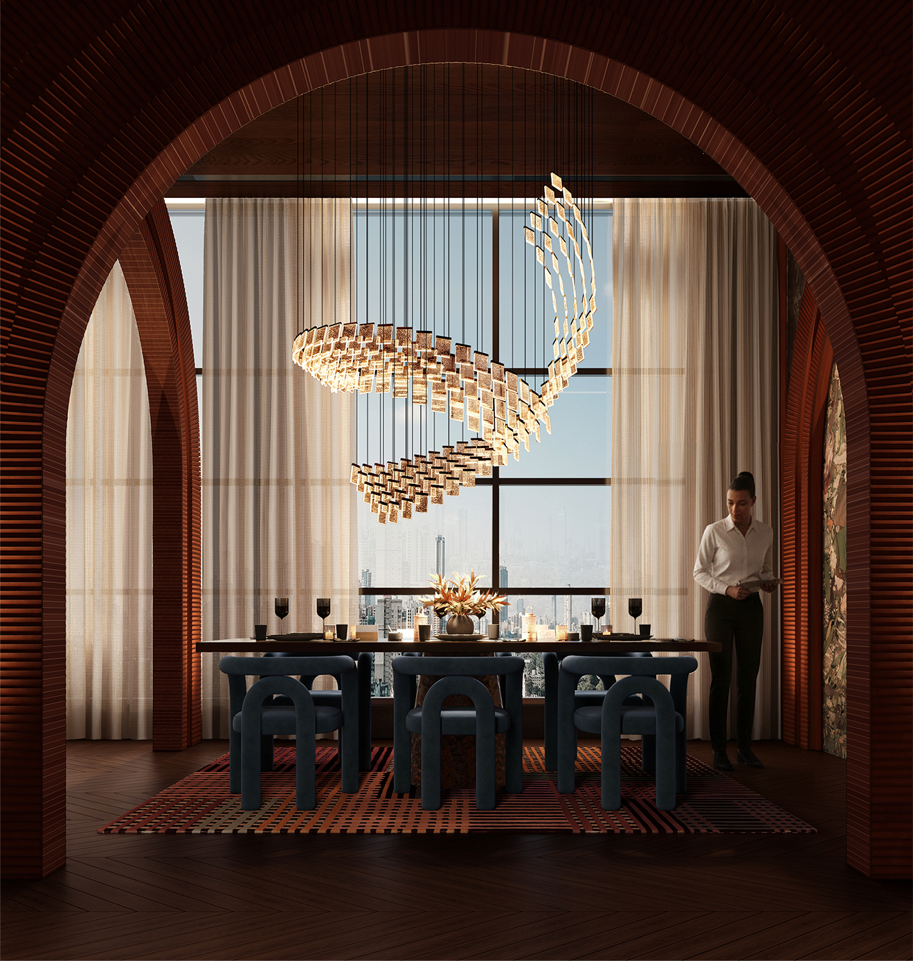 In contrast, the material palette draws from Peru’s bold identity—deep terracotta tones, richly patterned stone, and tactile textiles introduce warmth, depth, and vibrancy. Custom chandeliers, composed of delicate suspended elements, float like luminous installations, adding movement and theatricality to the space.