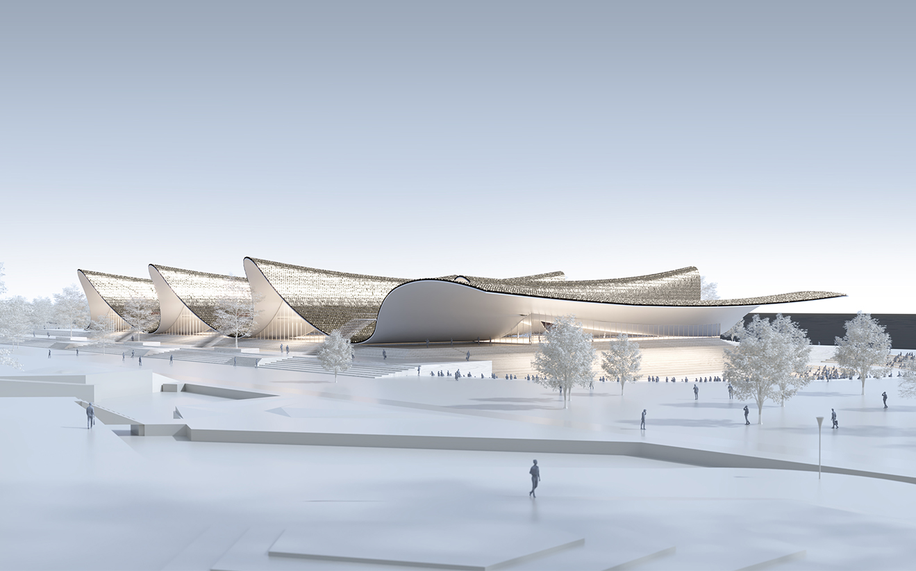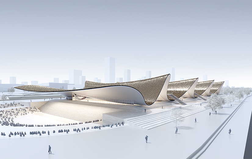 A visual connection can be made between the grouped dancing peaks of traditional Chinese roof structures and those of windblown water. The skin of the building evokes the scales of a dragon, an important figure in Chinese mythology.
