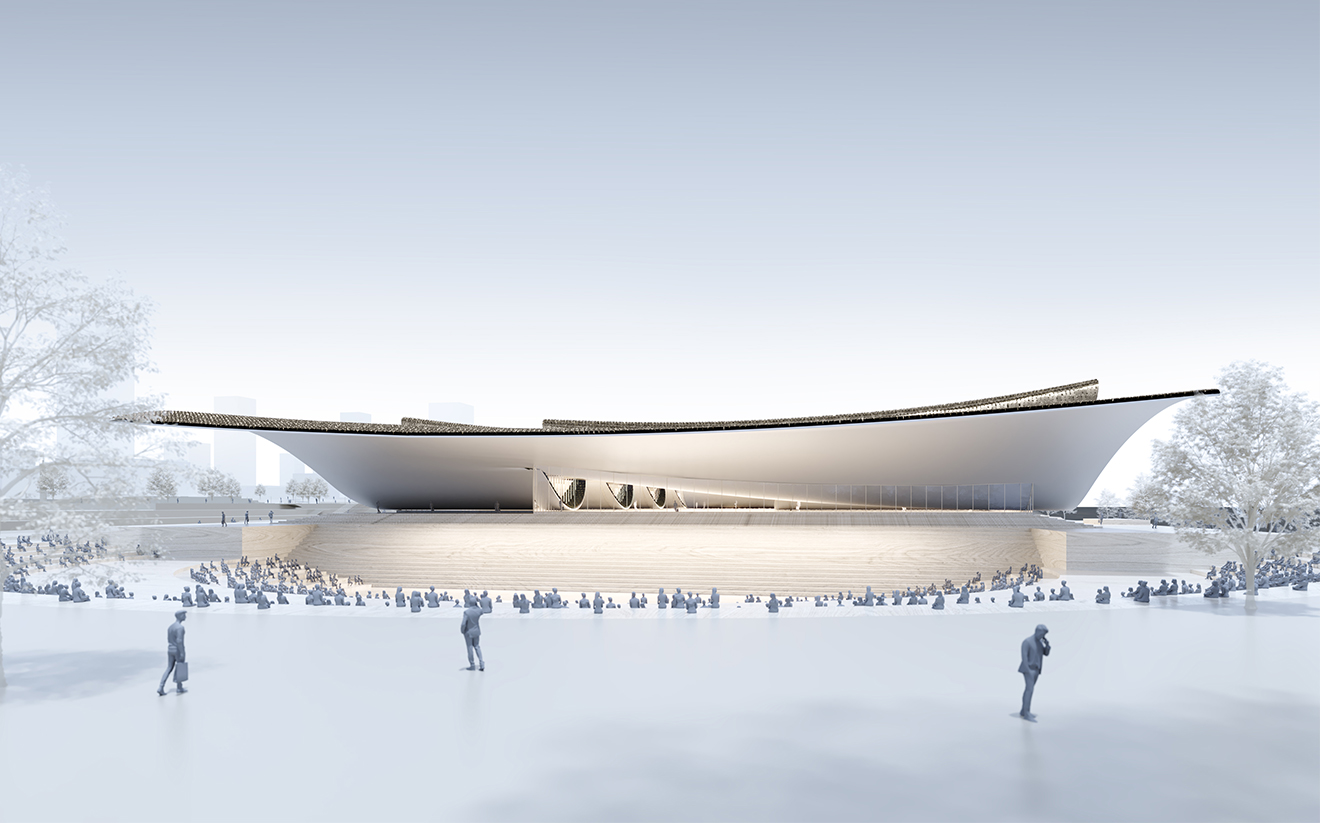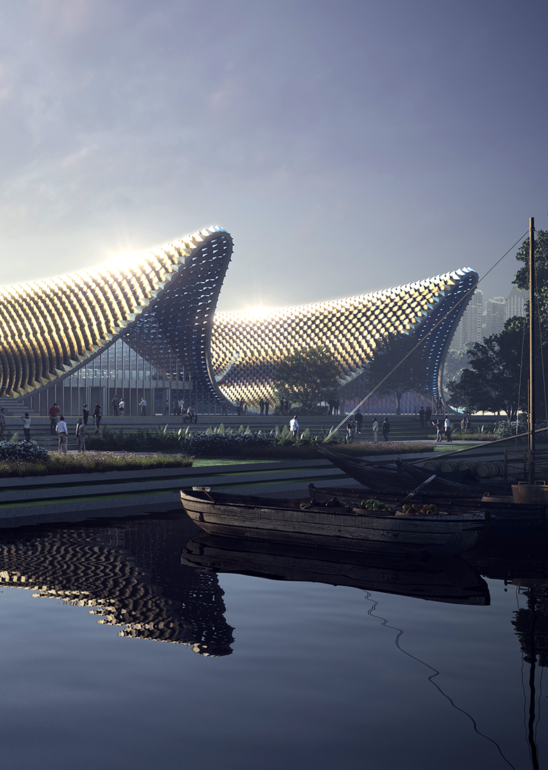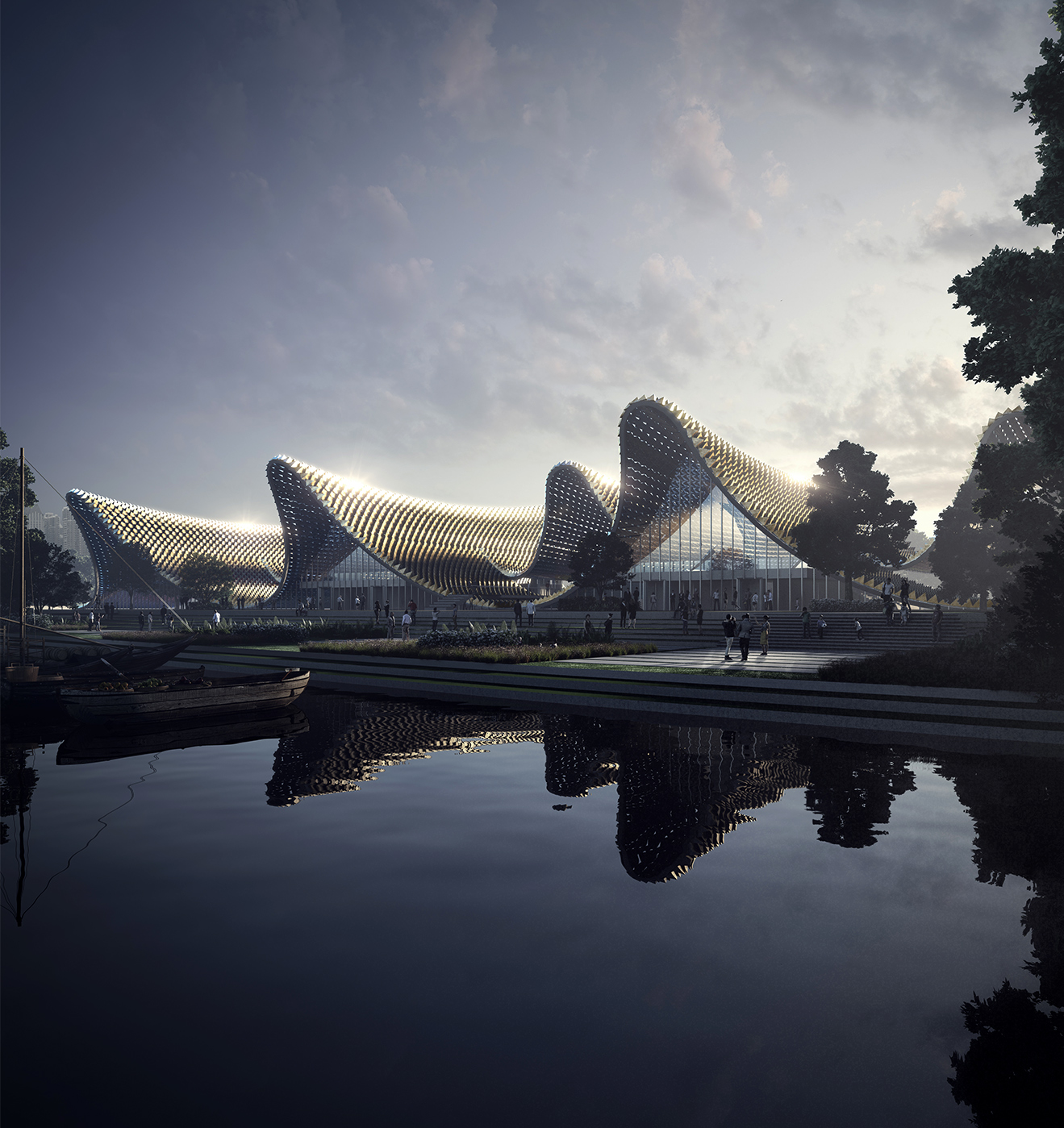 Water is symbolically important in Chinese architecture. The building features eight bays derived from the golden mean and a roof form that combines the rhythm of the bays with water. A bridge takes visitors to a viewing platform at the edge of the river.