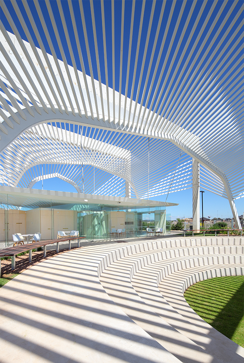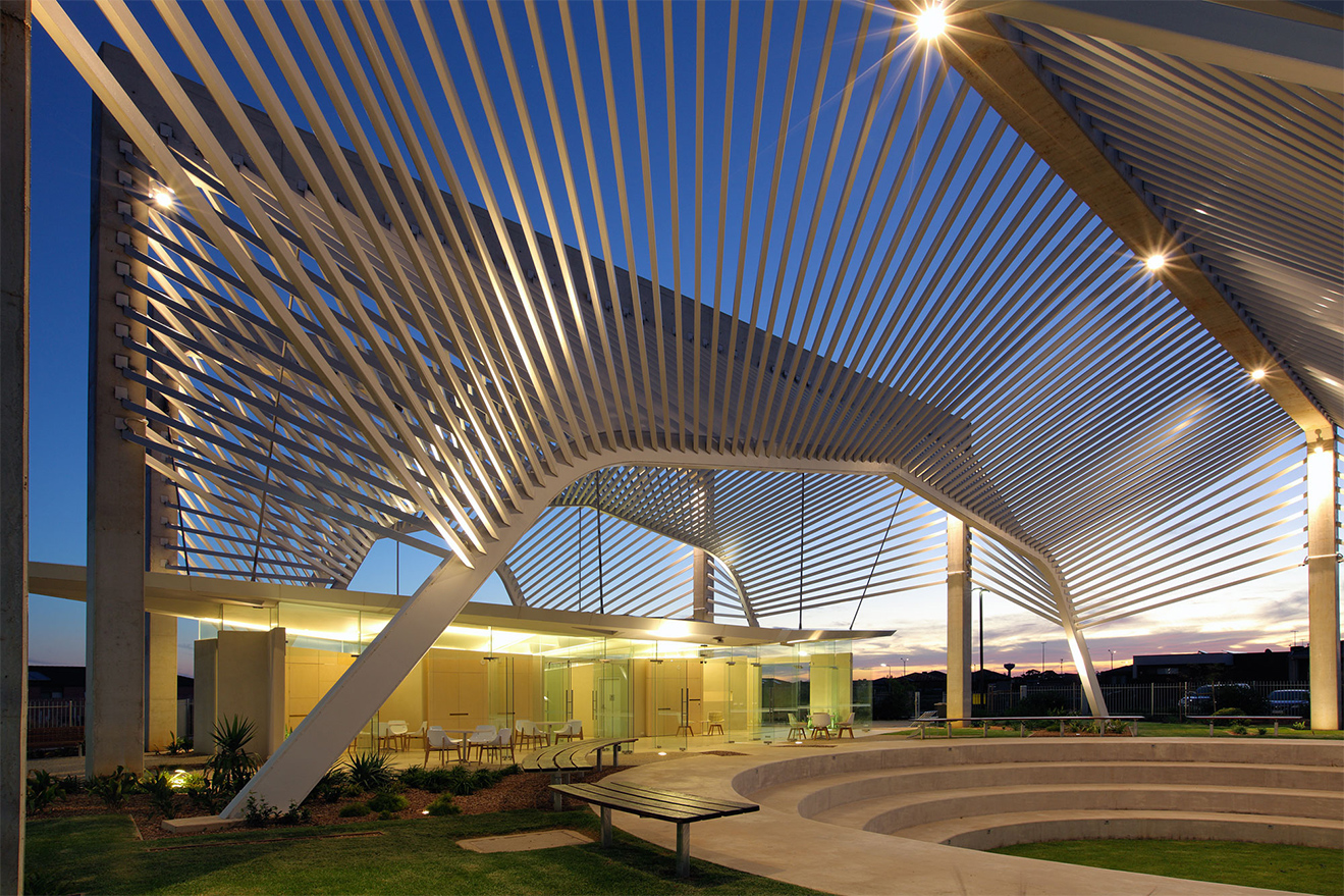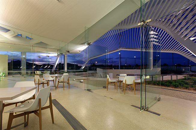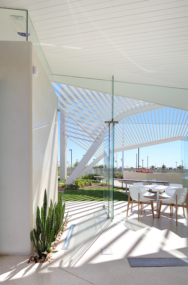 Openable glass panels showcase external views and provide multiple access points, while a huge skylight that runs through the interior spine bathes the pavilion in light with virtually no reliance whatsoever on artificial lighting. The concept is further underlined by the liberal use of raw and hardwearing materials including concrete and exposed aggregate flooring, as well as the inclusion of indoor plantings.