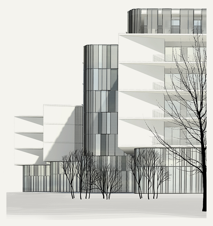 Glazed sections of the upper levels are intended to create a lantern effect, visible from distant vistas and supporting the notion of the building as a landmark. Design measures such as balcony screens protect the visual privacy of neighbouring houses.