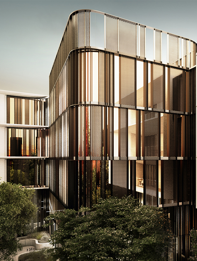 Morang Views is predominantly a five storey building with an apex that reaches nine stories, creating a central concentration that steps down to reduce building mass and maximise daylight. The architecture provides views of the immediate garden surrounds while also offering distant outlooks.