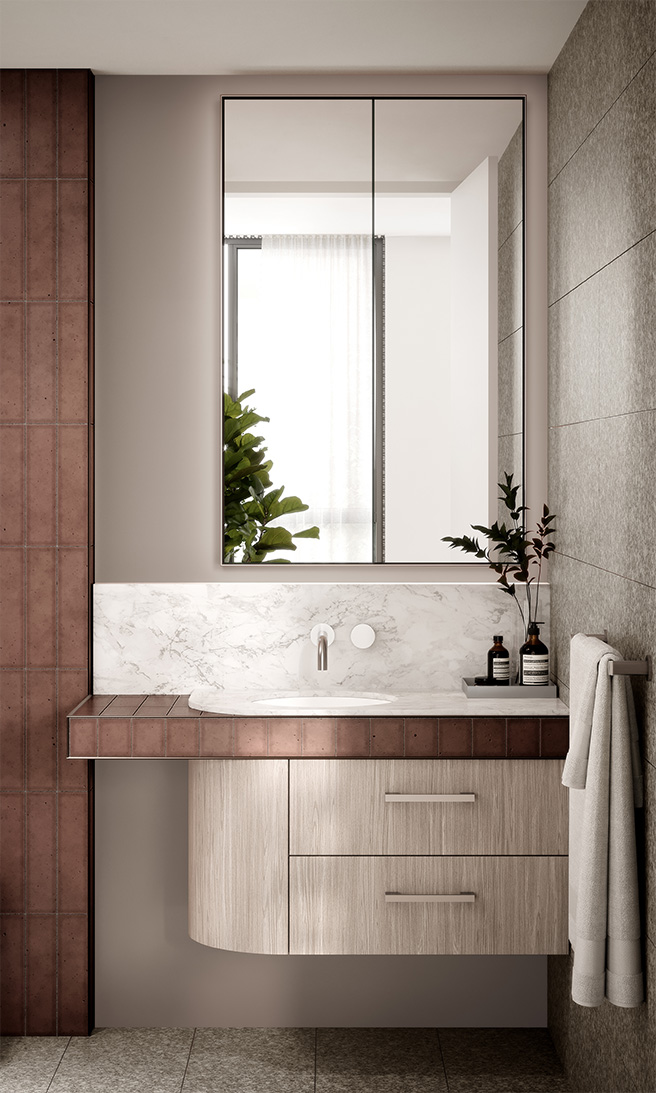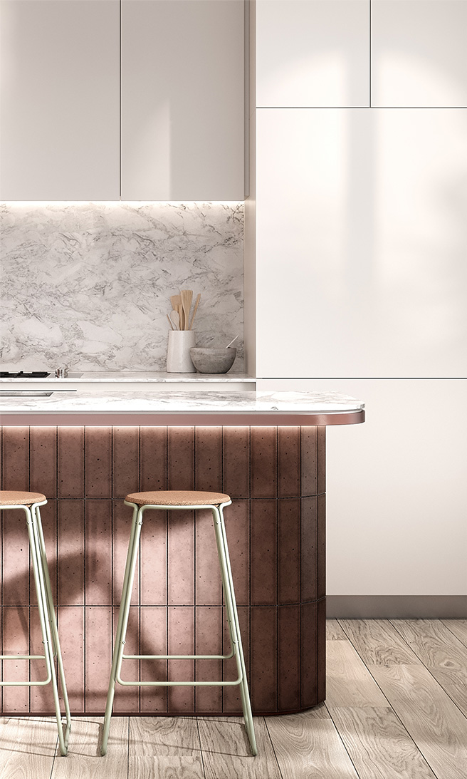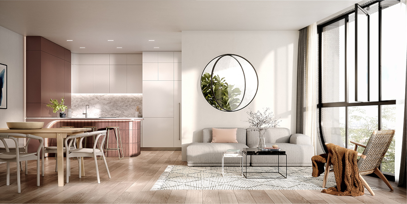 The interiors at Nexus have been thoughtfully designed with soft edges and bold shapes that tie in with the building’s architecture. Rooms are elevated with surfaces that accent a variety of textures, while colours and finishes evoke the familiar materials of the neighbourhood.